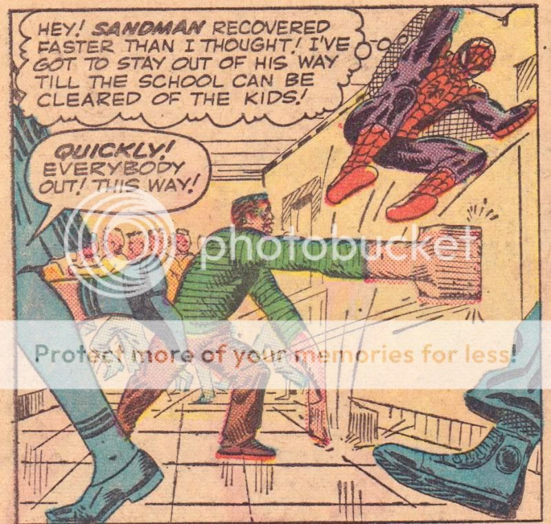 From quite early in Ditko's run you can see a typical characteristic of his compositions: the way the principal lines of force go in many directions at once, though not at all in a disordered manner, but in one revealing a very clever orchestration: maybe you don't need me pointing this out, but look at the horizontal thrust of the Sandman's arm, its angular relation to his other limbs, and its juxtaposition to Spider-Man's near-vertical, curving lines of motion and diagonal pose, as well as to the opposite diagonal of the girl's leg in the foreground (echoed by the pleats on her skirt), and the double diagonal of the foot and calf (at nearly a right angle to each other) stepping in from the right. The girl's other calf, meanwhile, reinforces the horizontal axis we began with. The many synecdochic limbs that drift off-frame place increased importance on the panel frame itself, on the panel's specific shape, and thereby on the relationship of the overall composition to its support.